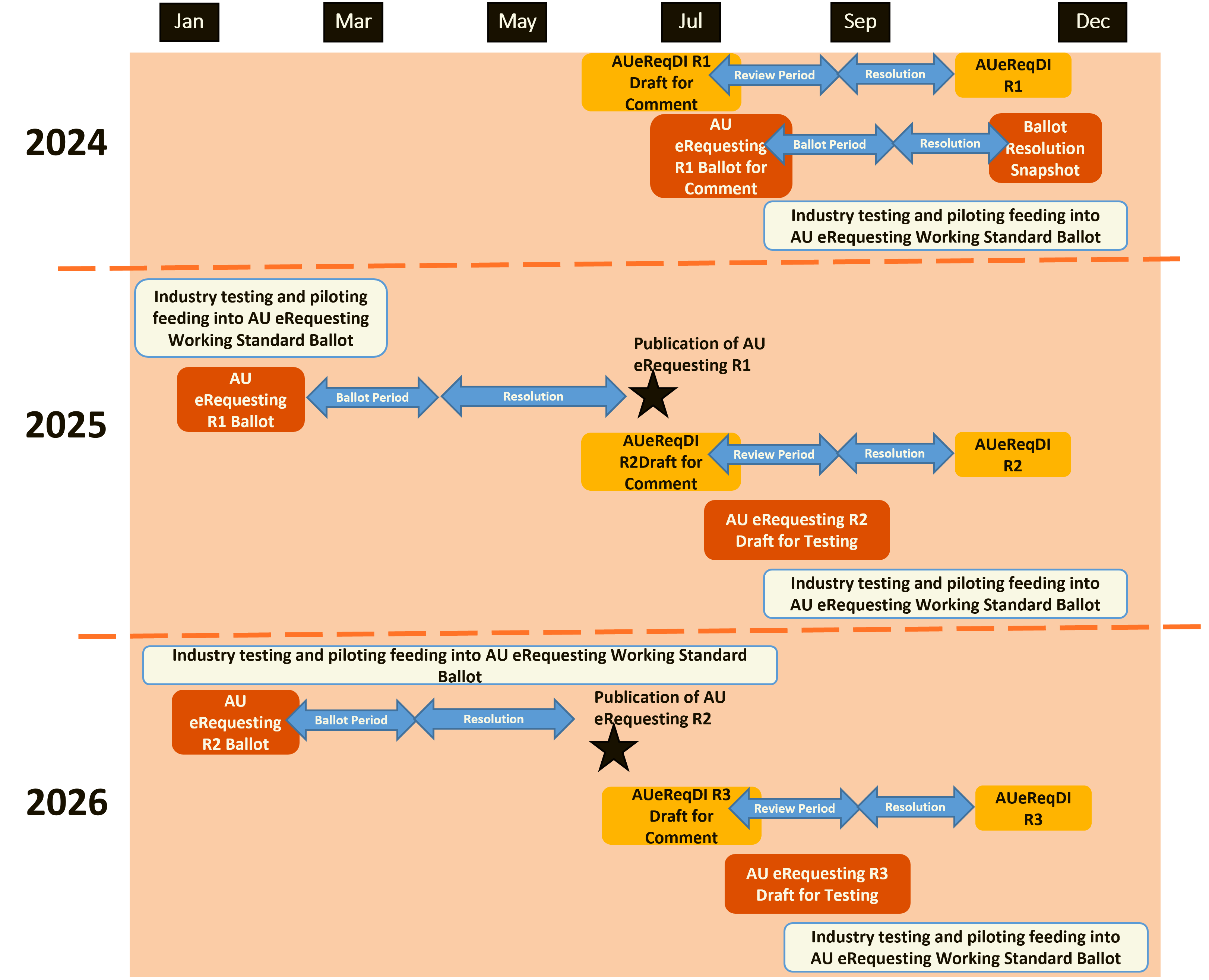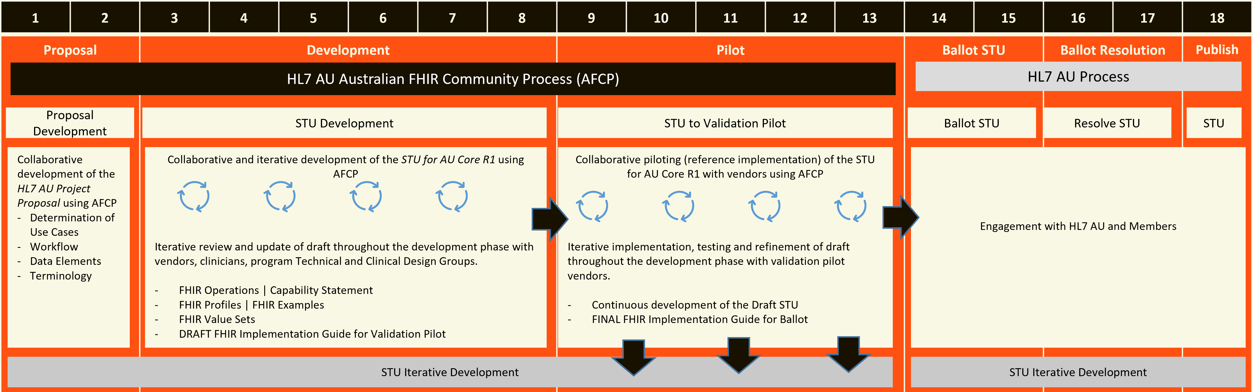 The first release of AU eRequesting is an 18 month process from HL7 AU proposal to publication of the first release, outlined in the figure below: