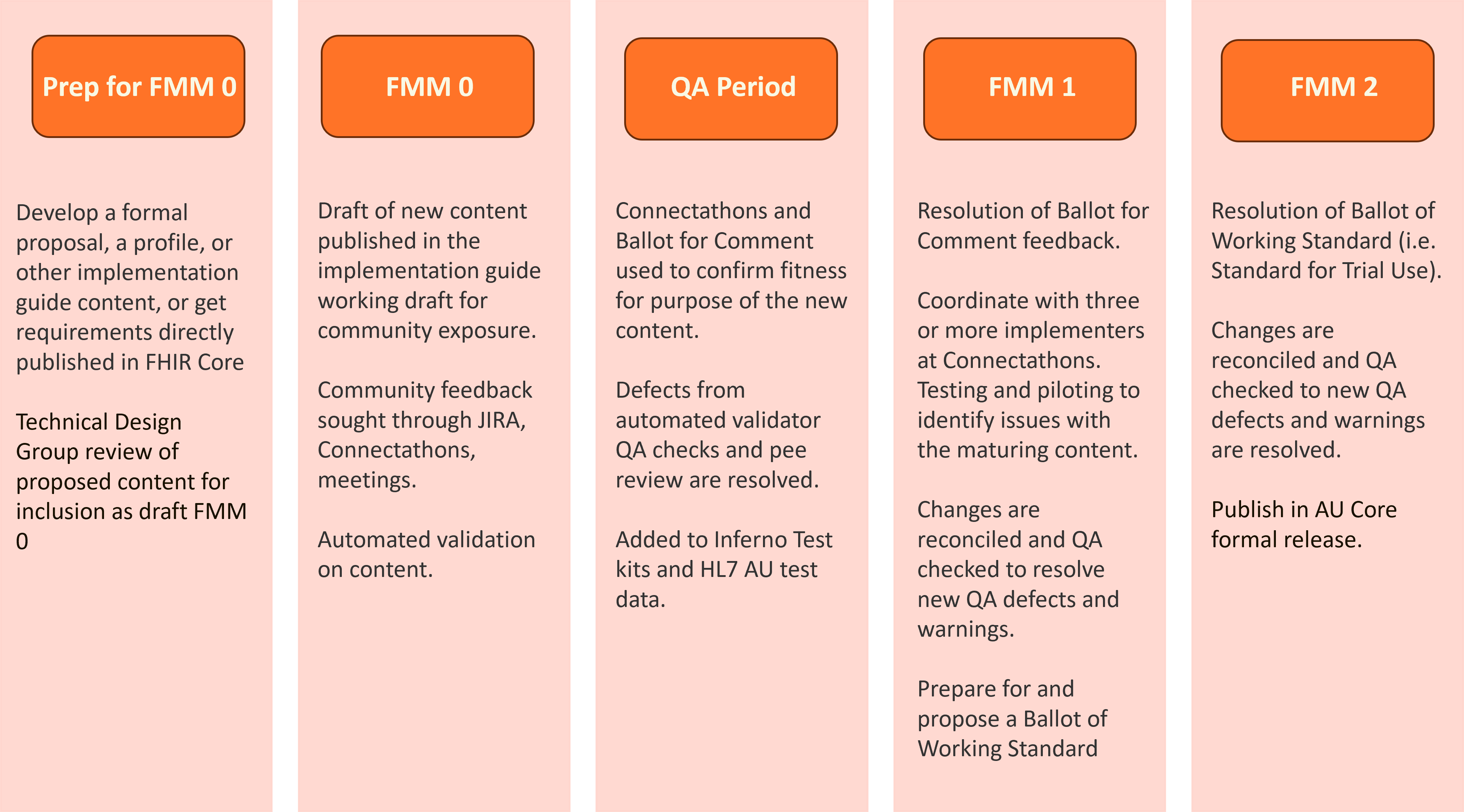 The approach to develop and mature AU eRequesting is outlined below making reference to the FHIR Maturity Level (FMM) levels is shown in the figure below.