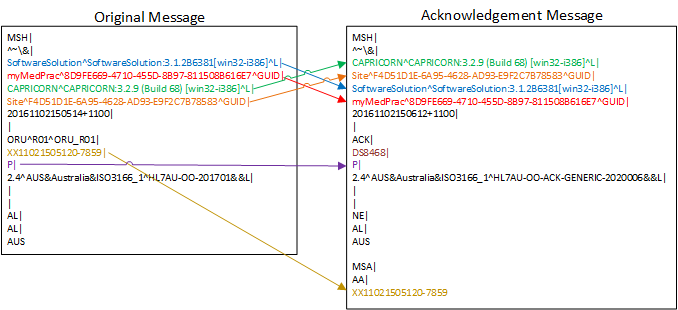 - Enter Original Message MSH-11(Processing ID) into ACK MSH-11(Processing ID). (Purple)