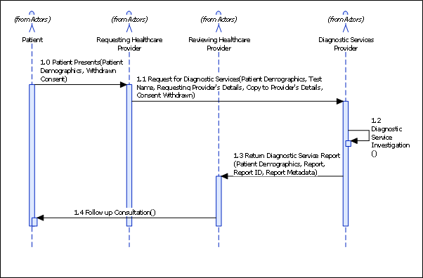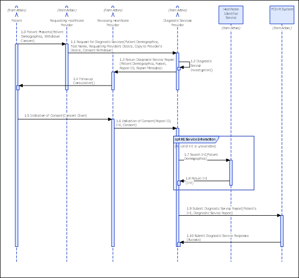 This sequence starts with the patient presenting to their Healthcare Provider. In this scenario (as with all scenarios in this paper) the consultation results in a diagnostic service being requested. The patient indicates to their Healthcare Provider that they withdraw their consent for the report to be uploaded to the PCEHR.